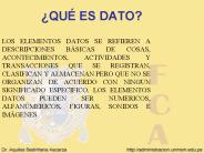Description: qu es dato? los elementos datos se refieren a descripciones b sicas de cosas, acontecimientos, actividades y transacciones que se registran, clasifican y ... – PowerPoint PPT presentation