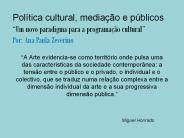 Description: Pol tica cultural, media o e p blicos Um novo paradigma para a programa o cultural Por: Ana Paula Zeverino A Arte evidencia-se como territ rio onde ... – PowerPoint PPT presentation