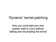 Description: Dynamic kernel patching How you could add your own system-calls to Linux without editing and recompiling the kernel System calls System Calls are the basic OS ... – PowerPoint PPT presentation