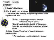Description: Earth - Moon System I. Earth s Motions: A. Earth has 2 real motions. 1. Rotation- The turning or spinning motion of an object on an axis. * Axis- – PowerPoint PPT presentation