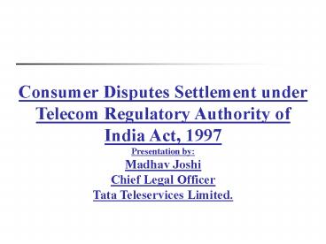 Consumer Disputes Settlement under. Telecom Regulatory Authority of India Act, 1997 ... monitoring through returns and thro' independent agency, public awareness. ... – PowerPoint PPT presentation