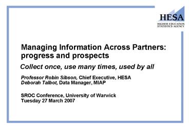 HESADeborah Talbot, Data Manager, MIAP - SROC Conference, University of WarwickTuesday