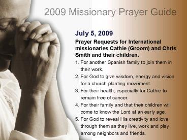 July 5, 2009. Prayer Requests for International missionaries Cathie (Groom) and ... 1. For a Hispanic church planter for western. Minnesota, specifically Worthington. ... – PowerPoint PPT presentation