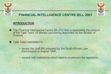 Title: FINANCIAL INTELLIGENCE CENTRE BILL 2001