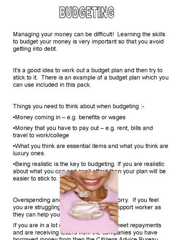 so that you avoid getting into debt. - Its a good idea to work out a budget plan and