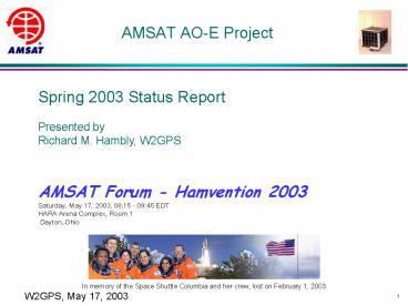 Project team is W4PUJ, W3IWI, and W2GPS. - 08-Feb-02 AMSAT-NA entered into agreement with