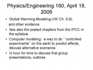 Title: PhysicsEngineering 160, April 18, 2006