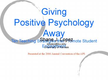 Shane J. Lopez. sjlopez_at_ku.edu. University of Kansas ... Share 10 teaching strategies for engaging students in the ... Jennifer Teramoto Pedrotti. Cal Poly ' ... – PowerPoint PPT presentation