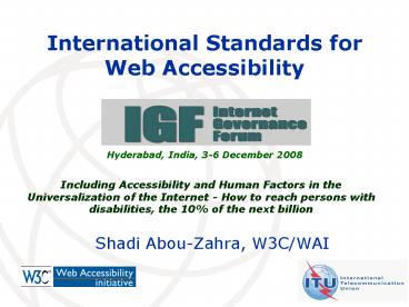 Shadi Abou-Zahra, W3C/WAI. IGF - Hyderabad, India, 3-6 December 2008. 2. W3C Web Accessibility Initiative. Standards making body for the Web ... – PowerPoint PPT presentation