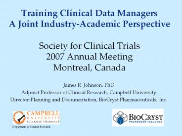 <Notice: Removed> Training Clinical Data Managers A Joint Industry-Academic Perspective Society for Clinical Trials 2007 Annual Meeting Montreal, Canada PowerPoint PPT Presentation