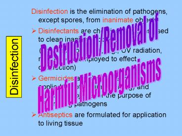- Disinfection is the elimination of pathogens,