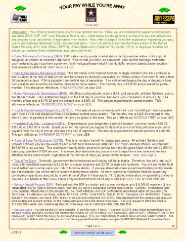 • Hostile Fire/Imminent Danger Pay (HF/IDP).