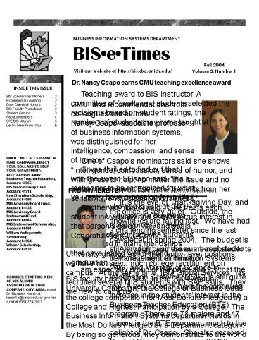 ... CITY, AREA: e-mail Dr. Elizabeth Kemm at kemm1e_at_cmich. ... Shannon Childs. Damon P. Lindley Achievement Award. Mary Mahon. William Wohlgamuth Scholarship ... – PowerPoint PPT presentation