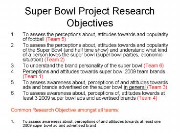 Super Bowl Project Research Objectives ... the brand personality of the super bowl (Team 6) Perceptions and attitudes towards super bowl 2009 team brands (Team 1) ... – PowerPoint PPT presentation