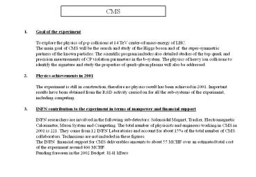 INFN researchers are involved in the following sub-detectors Solenoidal Magnet, Tracker, Electromagnetic Calorimeter, Muon System and Computing. The total number of physicists and engineers working in CMS in 2001 is 221. They come from 12 INFN Laboratories and account for about 15 of the total number of CMS collaborators. Technicians are not included in these figures.