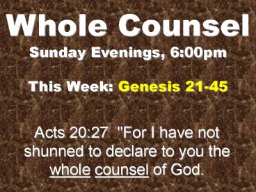 Title: Whole Counsel Sunday Evenings, 6:00pm This Week: Genesis 2145