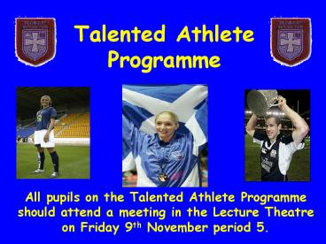Talented Athlete Programme. All pupils on the Talented Athlete ... Ciara Tierney (Irish Dancing) 3A5. Paula Houston (Athletics) 3A8. Talented Athletes S4 ... – PowerPoint PPT presentation