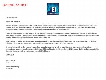 22 January 2008 Dear Koch Customer, We are