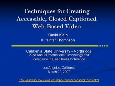 Techniques for Creating Accessible, Closed Captioned WebBased Video PowerPoint PPT Presentation