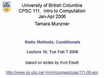 Title: Static Methods, Conditionals Lecture 10, Tue Feb 7 2006