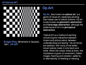 Op Art, also known as optical art, is a genre of