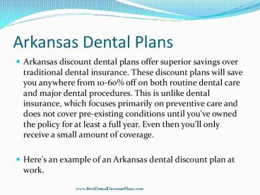 Arkansas discount dental plans offer superior savings over traditional dental insurance. These discount plans will save you anywhere from 10-60 off on both routine dental care and major dental procedures. This is unlike dental insurance, which focuses primarily on preventive care and does not cover pre-existing conditions until you've owned the policy for at least a full year. Even then you'll only receive a small amount of coverage.