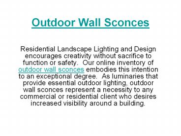 Outdoor fluorescent wall sconces will serve to enhance the edifice any church, civic building. They can also compliment a corporations branding. Companies that emphasize self-containment and forward motion in their public relations often prefer to contract a lighting design company that can keynote their buildings architecture with decorative elements that represent professionalism, good taste, conservatism, and future-mindedness. Architectural lighting design firms frequently discover that RLLDs functional ceramic outdoor wall sconces fulfill this desire quite well. These same fixtures are often the preferred choice of many contemporary art galleries as an external, illuminated motif representative of their interior content. In quiet, exclusive, and gated communities where the wealthy live reserved and peaceful lives, contractors and design consultants often find that period-theme fixtures fit not only the tastes of these clients, but also the architecture of many custom homes. Lantern style rustic outdoor wall sconces speak to many archetypes of the past with a form that communicates a sense of the timeless.