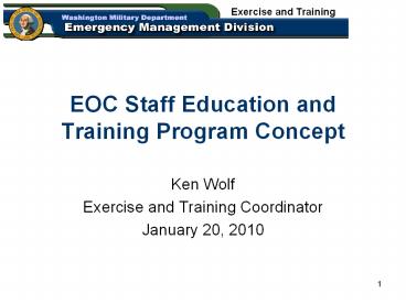 EOC Staff Education and Training Program Concept Ken Wolf Exercise and Training Coordinator January 20, 2010 * * Agenda Purpose Desired Outcomes Education and ... – PowerPoint PPT presentation