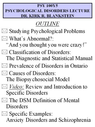 Title: PSY 100Y5 PSYCHOLOGICAL DISORDERS LECTURE DR. KIRK R. BLANKSTEIN