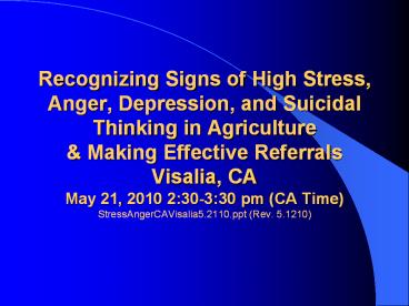 <Notice: Removed> Recognizing Signs of High Stress, Anger, Depression, and Suicidal Thinking in Agriculture & Making Effective Referrals Visalia, CA May 21, 2010 2:30-3:30 pm (CA Time) StressAngerCAVisalia5.2110.ppt (Rev. 5.1210) PowerPoint PPT Presentation
