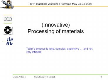 SRF materials Workshop Fermilab May 23-24, 2007 (Innovative) Processing of materials Today s process is long, complex, expensive and not very efficient – PowerPoint PPT presentation