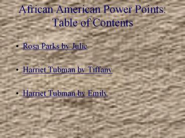 African American Power Points: Table of Contents Rosa Parks by Julie Harriet Tubman by Tiffany Harriet Tubman by Emily Rosa Parks By: Julie Schmidt Rosa s Lifestyle ... – PowerPoint PPT presentation