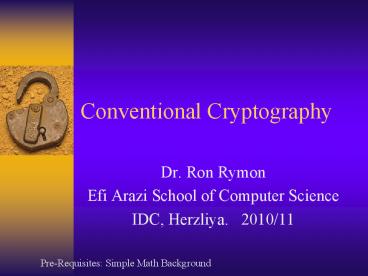 Conventional Cryptography Dr. Ron Rymon Efi Arazi School of Computer Science IDC, Herzliya. 2010/11 Pre-Requisites: Simple Math Background * * The Chinese researchers ... – PowerPoint PPT presentation