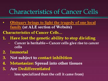 family (at ALE section of Website) - Characteristics of Cancer Cells
