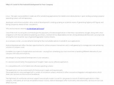 Linux-- the open source platform made use of for establishing applications for tablets and mobile phones is quick ending up being a popular operating system with entrepreneur,.developers and online marketers alike. Android development is ending up being an essential means of generating higher profit figures and taking companies ahead of their competitors.Why are businesses selecting ios developer gold coast?One of the most crucial quality contributing to the popularity of Android Applications is that they is powered by Google. Along with a stoic integration with the ever before broadening Java library, Android OS has dependable and very strong database abilities and is proving to be among the most essential ways of generating greater income streams.As a company owner, you are certainly looking for the most pliable options to establish your applications.Android development offers the best opportunities for online company transactions and is well geared up to manage your ever enhancing volumes of company work.It enables you a gamut of applications and services-- varying from scheduling your task time lines to handling different elements of your company with ease and simplicity.Advantages of using Android Development in your company.It is economical and led by the experience of Google's Open source software application.It is compatible with a lot of tablet and software operating systems.The applications can be customized to fit the business's needs and requirements.These applications come packaged with a variety of circulation systems.Android OS offers innovative integration and applications which steer your business on the course of excellence.The high levels of worldwide customer support have actually made it crucial for companies to consist of Android applications in their company. With plenty of services and pliable choices in store, Android developers offer trustworthy and noteworthy services at most cost effective prices.