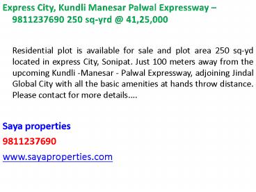 Residential plot is available for sale and plot area 250 sq-yd located in express City, Sonipat. Just 100 meters away from the upcoming Kundli -Manesar - Palwal Expressway, adjoining Jindal Global City with all the basic amenities at hands throw distance. Please contact for more details....