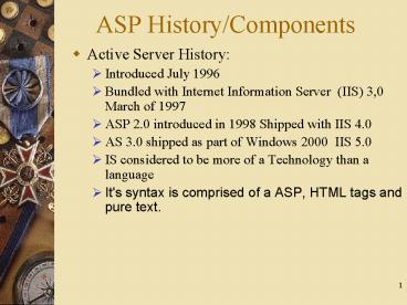 • ASP 2.0 introduced in 1998 Shipped with IIS 4.0