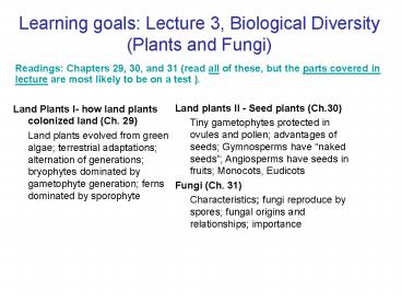Monocots, Eudicots Fungi (Ch. 31) Characteristic