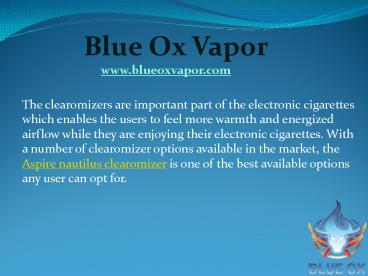 The Aspire nautilus clearomizer is one of the best of its kind which is suitable all esmoke users to have better experience with their esmokes. The clearomizers act as a refinement to the esmokes wherein more warm vapor and perfect airflow is enjoyed buy the ecig user. – PowerPoint PPT presentation
