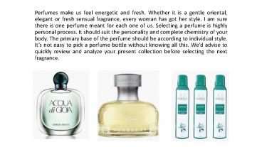 Perfumes make us feel energetic and fresh. Whether it is a gentle oriental, elegant or fresh sensual fragrance, every woman has got her style. I am sure there is one perfume meant for each one of us. Selecting a perfume is highly personal process. It should suit the personality and complete chemistry of your body. The primary base of the perfume should be according to individual style. Its not easy to pick a perfume bottle without knowing all this. Wed advise to quickly review and analyze your present collection before selecting the next fragrance.
