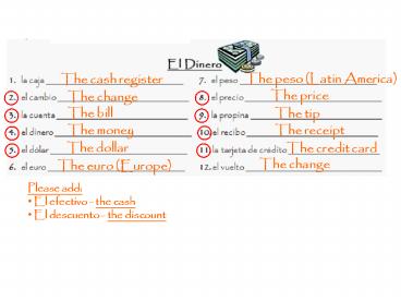 1 The peso (Latin America) The cash register The price The change The bill The tip The money The receipt The dollar The credit card The change The euro (Europe)