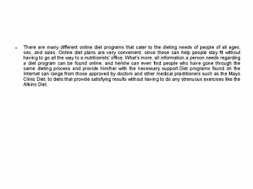 There are many different online diet programs that cater to the dieting needs of people of all ages, sex, and sizes. Online diet plans are very convenient, since these can help people stay fit without having to go all the way to a nutritionists' office. What's more, all information a person needs regarding a diet program can be found online, and he/she can even find people who have gone through the same dieting process and provide him/her with the necessary support.Diet programs found on the Internet can range from those approved by doctors and other medical practitioners such as the Mayo Clinic Diet, to diets that provide satisfying results without having to do any strenuous exercises like the Atkins Diet.