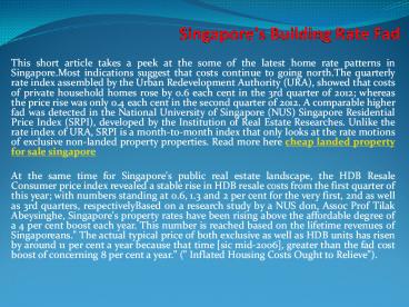 This short article takes a peek at the some of the latest home rate patterns in Singapore.Most indications suggest that costs continue to going north.The quarterly rate index assembled by the Urban Redevelopment Authority (URA), showed that costs of private household homes rose by 0.6 each cent in the 3rd quarter of 2012 whereas the price rise was only 0.4 each cent in the second quarter of 2012. A comparable higher fad was detected in the National University of Singapore (NUS) Singapore Residential Price Index (SRPI), developed by the Institution of Real Estate Researches. Unlike the rate index of URA, SRPI is a month-to-month index that only looks at the rate motions of exclusive non-landed property properties. Read more here cheap landed property for sale singapore