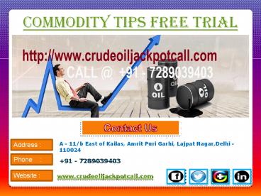 Crude Oil Jackpot Call a home of experts of the Advance Tech & Fundamental Analysis in Commodity Crude Oil markets. Our knowledgeable analyst team expert in fundamental and technical delivers you high quality of Crude Oil Trading Tips, MCX Trading Call, and Commodity Trading Call services to make good profit. Our MCX tips continues success rate given over 90% profit calls. We give limited calls & good calls our success rate 80% to 95% we can promise you TOP service from us with time to time update when to buy or sell & exit to make excellent income. – PowerPoint PPT presentation