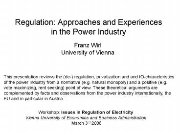 Title: Regulation: Approaches and Experiences in the Power Industry
