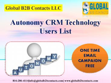 The Technology Users Mail List provided by Global B2B Contacts provides consistent and complete list of contact information of functional heads and various other department of the industry verticals. We provide the most convenient method to reach out and collaborate with global business and achieve your business goals easily. info@globalb2bcontacts.com www.globalb2bcontacts.com – PowerPoint PPT presentation