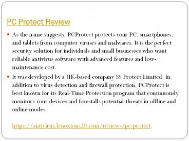 PC Protect is a new antivirus program in the antivirus market. Still, it has proved its worth with advanced features and a reliable team of professionals who are ready to hear about your worries and give you instant solutions. The software itself is pretty reliable because it works silently in the background and informs you whenever a threat is detected.https//antivirus. lenoxtons20.com/reviews/pc-protect