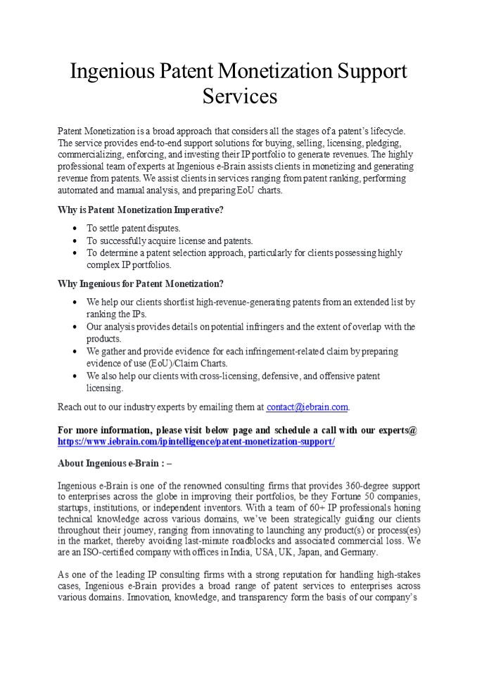 1Ingenious Patent Monetization Support Services