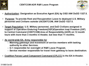 ... of Responsibility (AOR) on 12 month tours with more than 3 months in theater, ... Service member responsible for travel from gateway to leave destination. ... – PowerPoint PPT presentation
