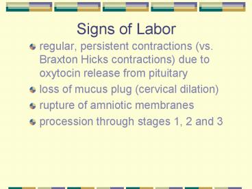 Signs of Labor. regular, persistent contractions (vs. Braxton Hicks contractions) ... vaginal birth rates higher. Lactation. pregnancy hormones caused growth ... – PowerPoint PPT presentation